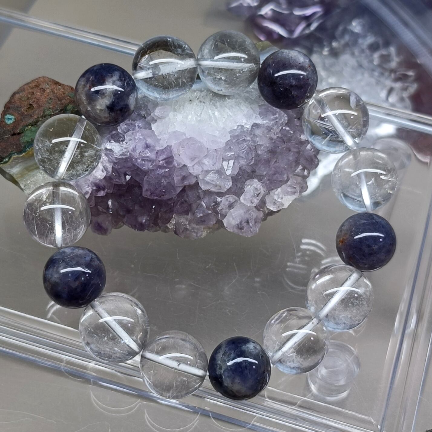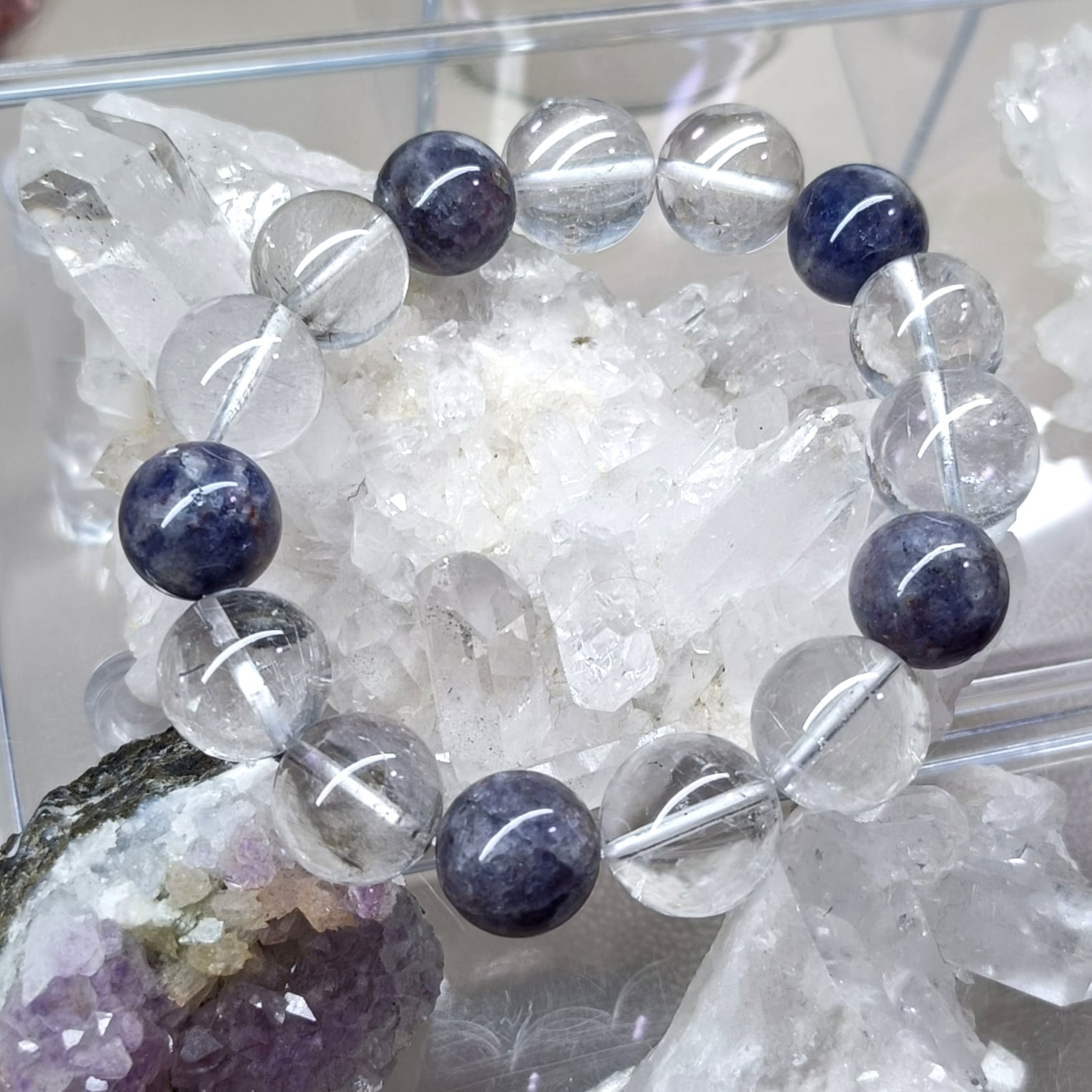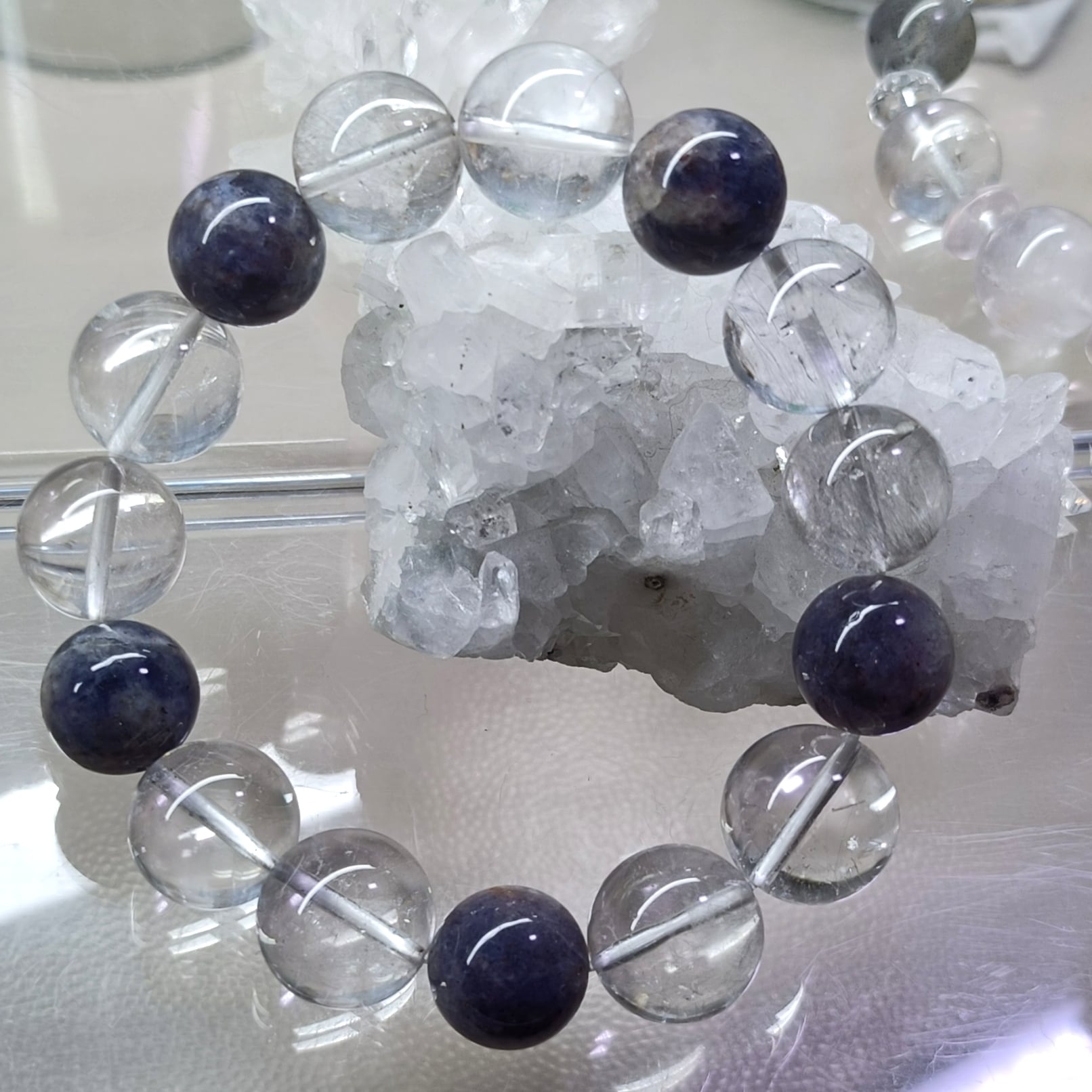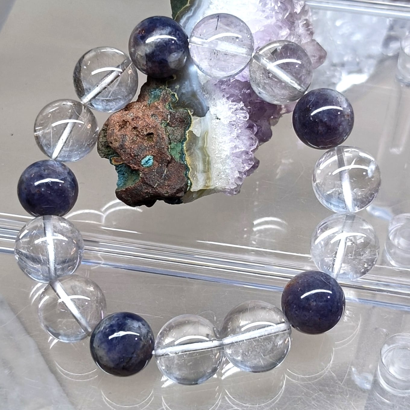 「人生の羅針盤」: アイオライトの「道を示す」力とサンストーンの「自信と活力」を与える力が合わさり、迷いや不安を乗り越え、前向きに進む力を与えるとされます。